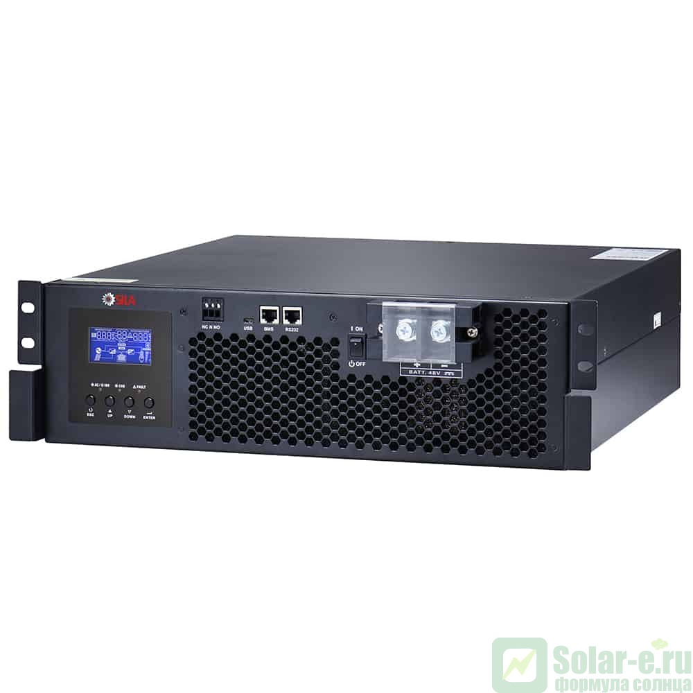 Онлайн гибридный солнечный инвертор SILA K 5000MO ( RM ) стоечного исполнения это уникальный и единственный в своем роде ОНЛАЙН инвертор со временем переключения 0 секунд и стабилизацией выходного напряжения, а так же множеством других полезных функций. SILA K 5000MO ( RM ) это усовершенствованный многофункциональный онлайн инвертор/зарядное устройство c PF 1.0 мощностью 5 кВт и с мощностью СБ 4кВт в котором сочетаются функции ИБП ( с двойным преобразованием сигнала ), инвертора, сетевого инвертора, контроллера заряда аккумуляторов от солнечных батарей и зарядного устройства аккумуляторных батарей от сети 220В для обеспечения бесперебойной подачи питания, с возможностью выбора приоритетов зарядки и нагрузки.